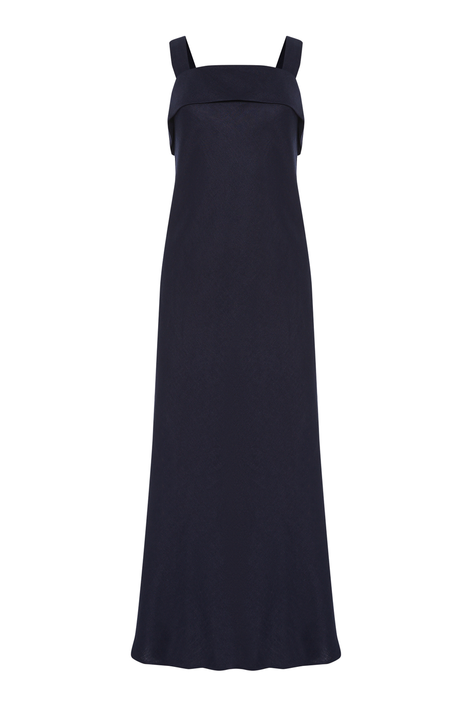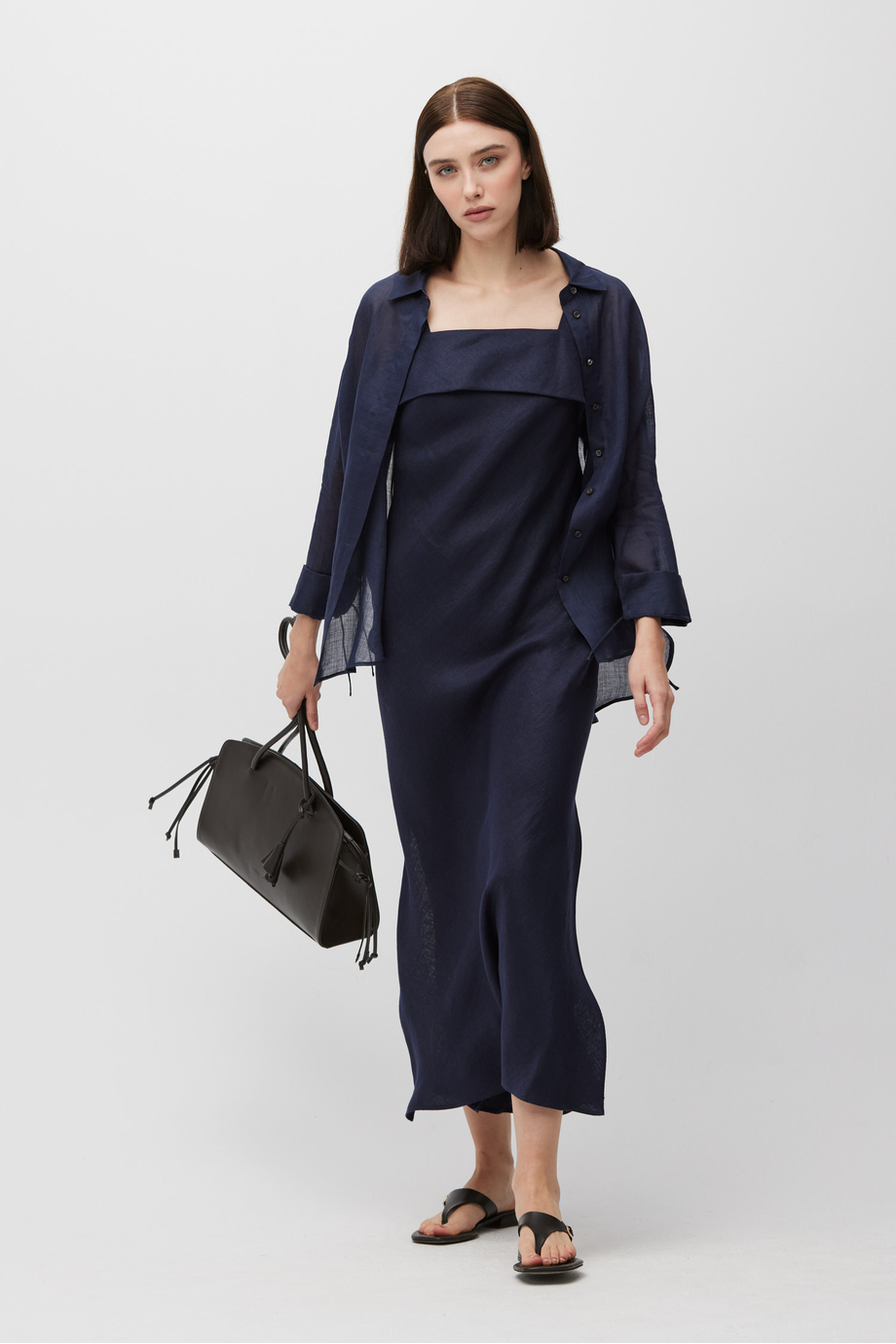 Dunkelblaues Kleid aus Leinen. Quadratischer Ausschnitt. Körpernahe Passform. Midi-Länge mit seitlichen Schlitzen. Verschluss am Rücken. Dekorative Innenverarbeitung. Passend dazu Hemd aus Ramie in derselben Farbe.