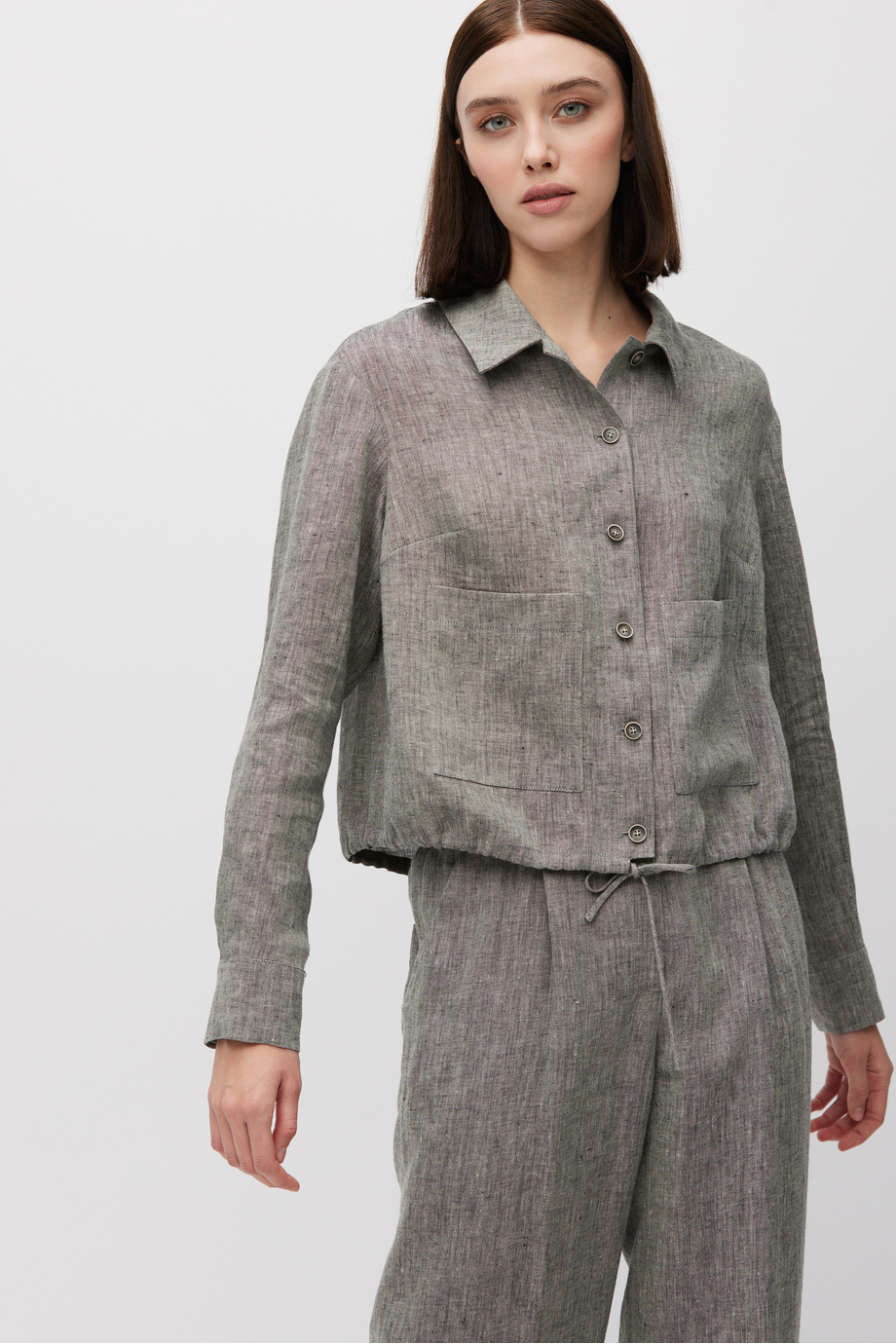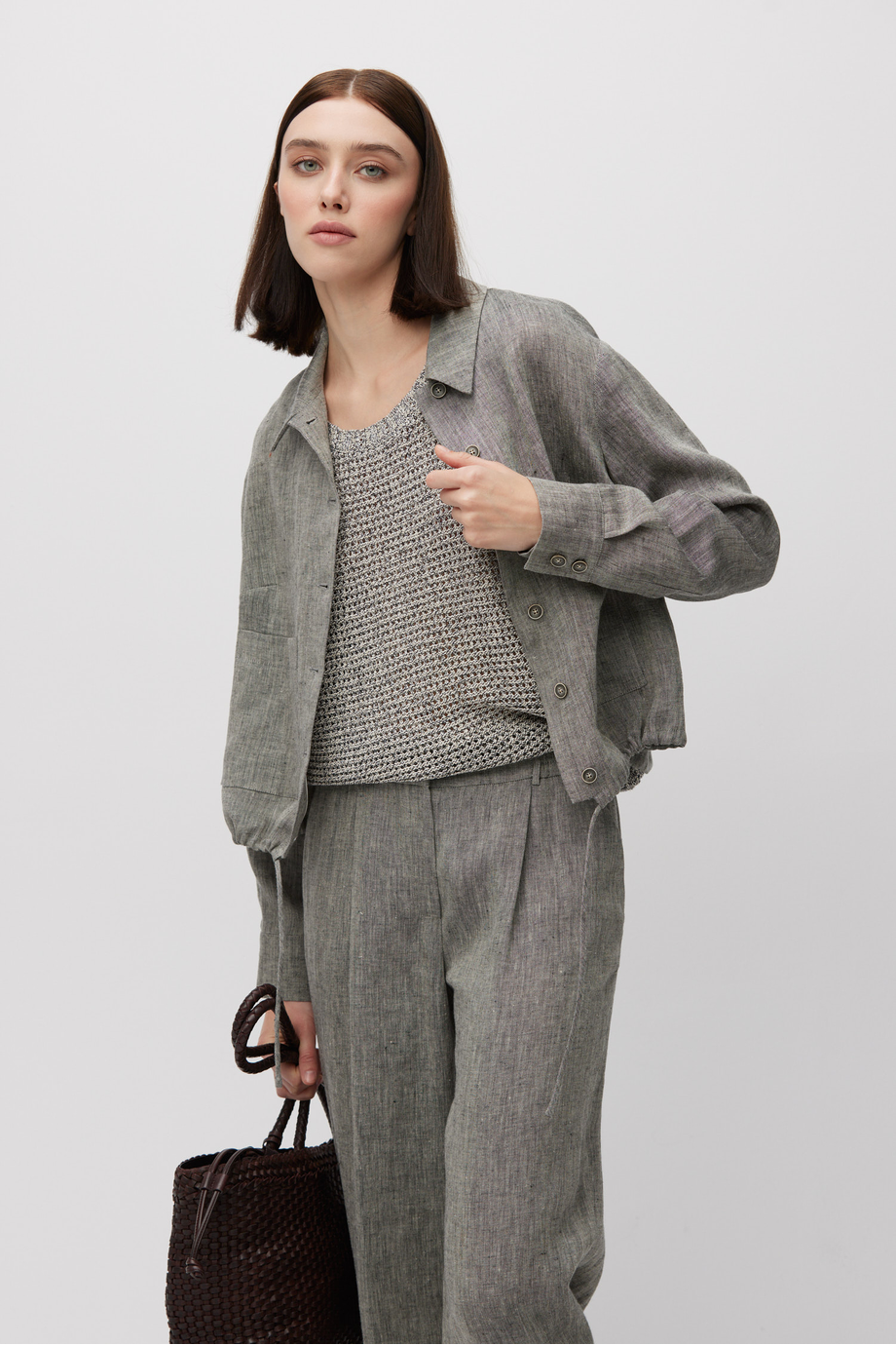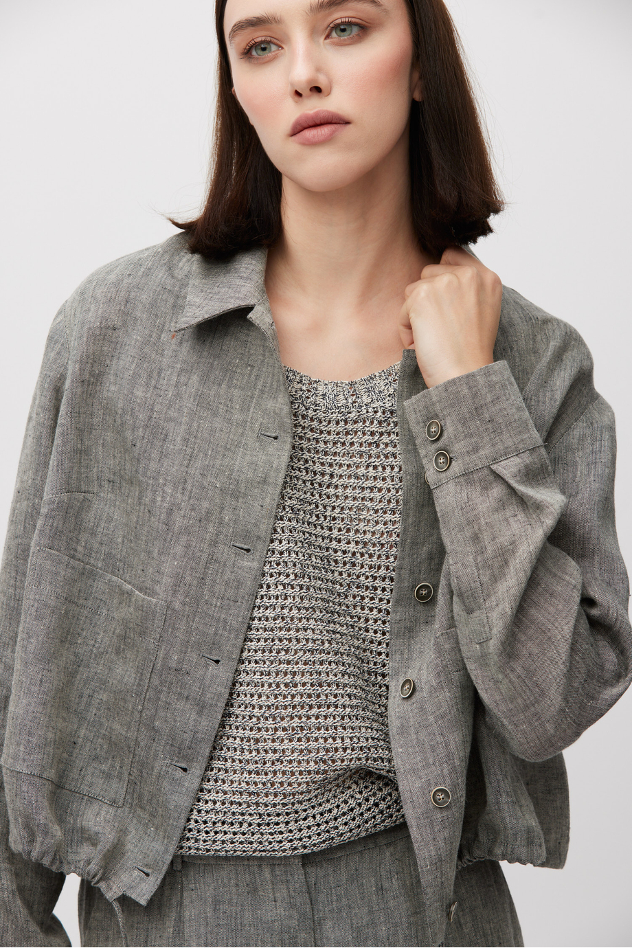 Kurzer Blazer aus Leinen. Kragen, lange Ärmel, Taschen. Halbgefüttert, mit dekorativem Piping innen. Lockere Passform. Knopfverschluss. Farbe grau meliert. Passend dazu Hose aus demselben Stoff.