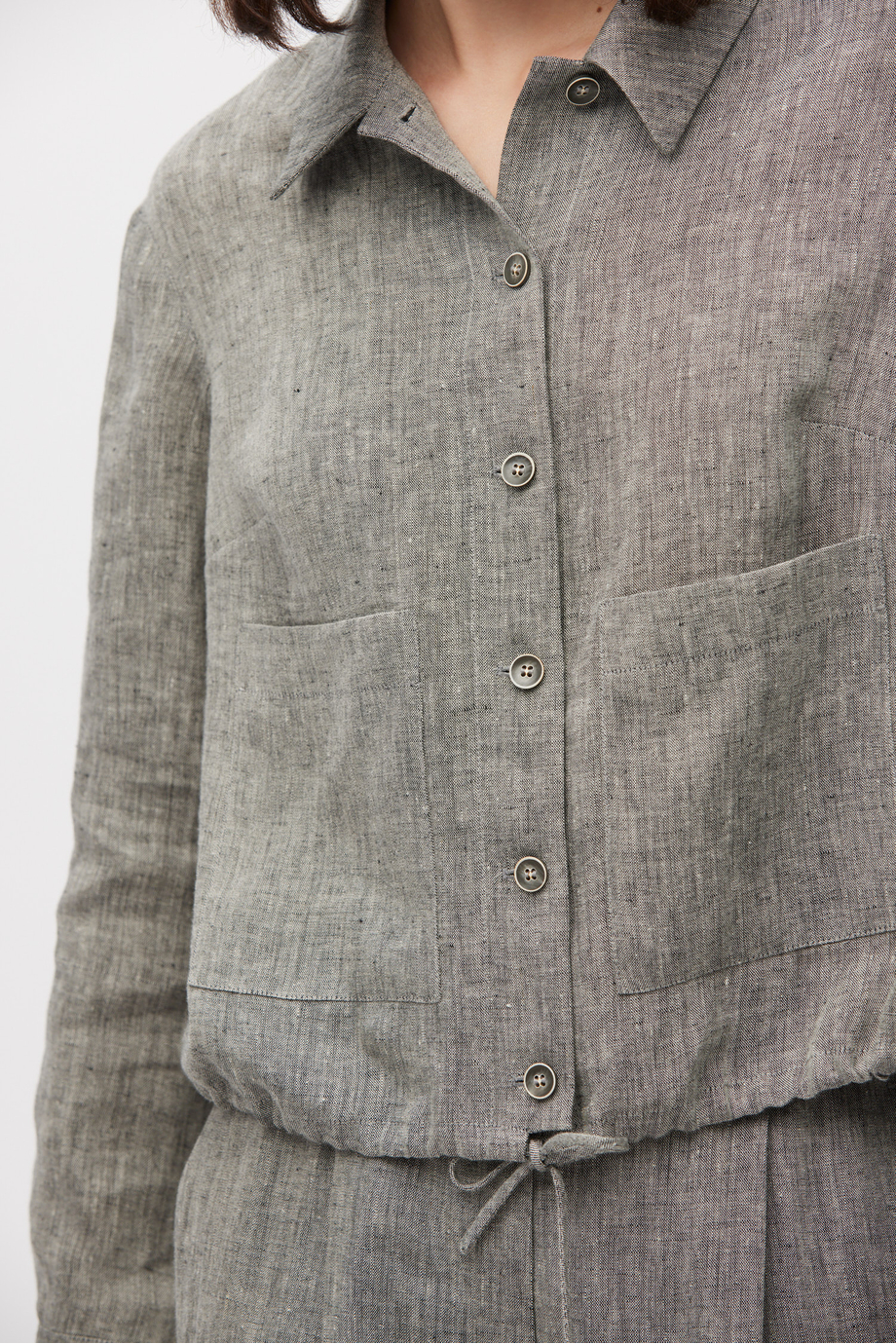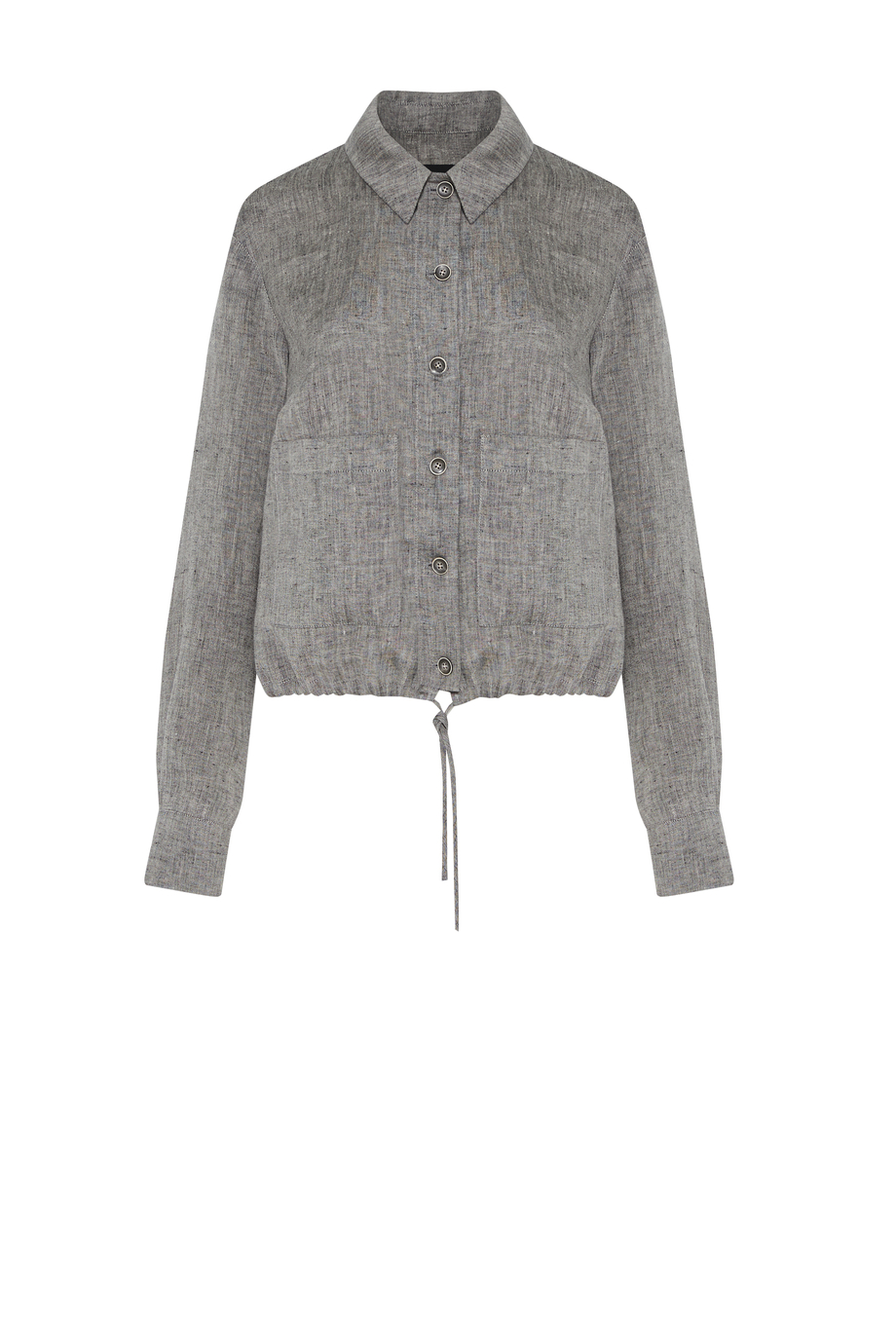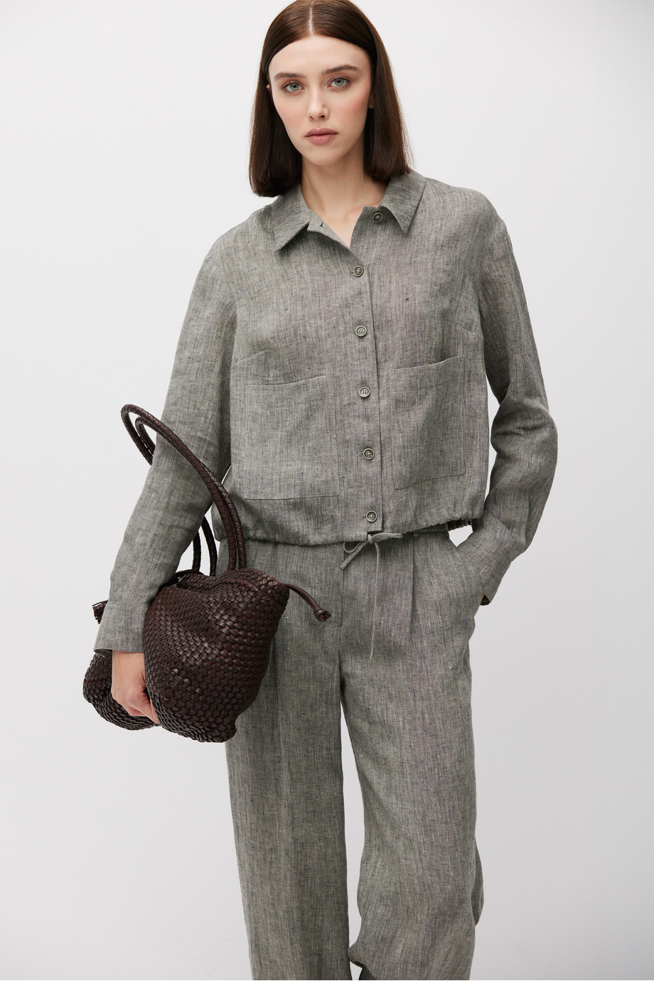 Kurzer Blazer aus Leinen. Kragen, lange Ärmel, Taschen. Halbgefüttert, mit dekorativem Piping innen. Lockere Passform. Knopfverschluss. Farbe grau meliert. Passend dazu Hose aus demselben Stoff.